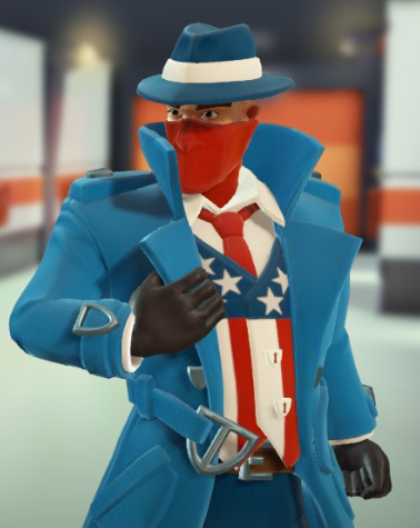 Agent X wears a blue fedora with a white stripe. To help conceal his face, he guards it with a red bandana. Agent X wears a blue trench coat and black gloves. Beneath that is a vest textured with the American flag. Agent X wields two shotguns "Truth" and "Justice". Justice being red, and Truth being blue.