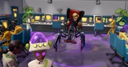 Emma wears a formal black dress with a skull badge on it and she dons a yellow bead necklace. Emma rides on a chair with robotic spider like legs with several buttons, a control stick, and a phone. She was formerly the spy master of H.A.M.M.E.R., but after the evil genius took over the world, she helped reform H.A.M.M.E.R. after the fall of the genius. However, upon seeing the world go back to its petty bickering, she realized she needed to end the world.