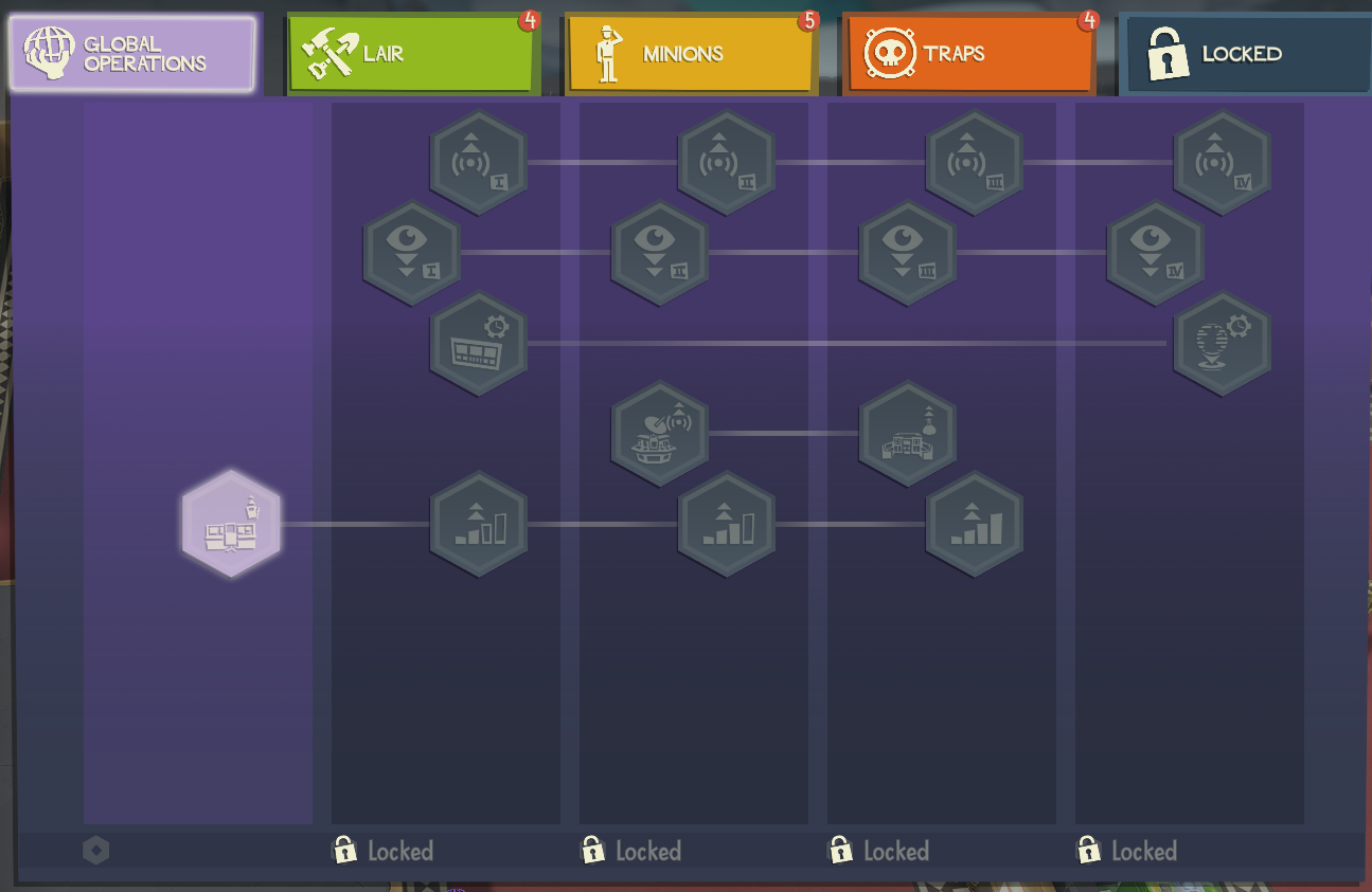 Global Operations holds all research related to World-Stage. Granting passive bonuses to Signal-strength and Heat-generation, unlocking advanced equipment and the higher-tier criminal networks.